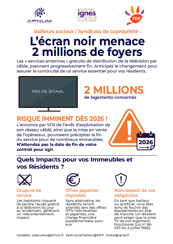 Distribution collective de la télévision : L’AFNUM, l’IGNES, et TDF, appellent les bailleurs sociaux et syndics de copropriété à anticiper l’arrêt de leur service de réception de la télévision par câble.